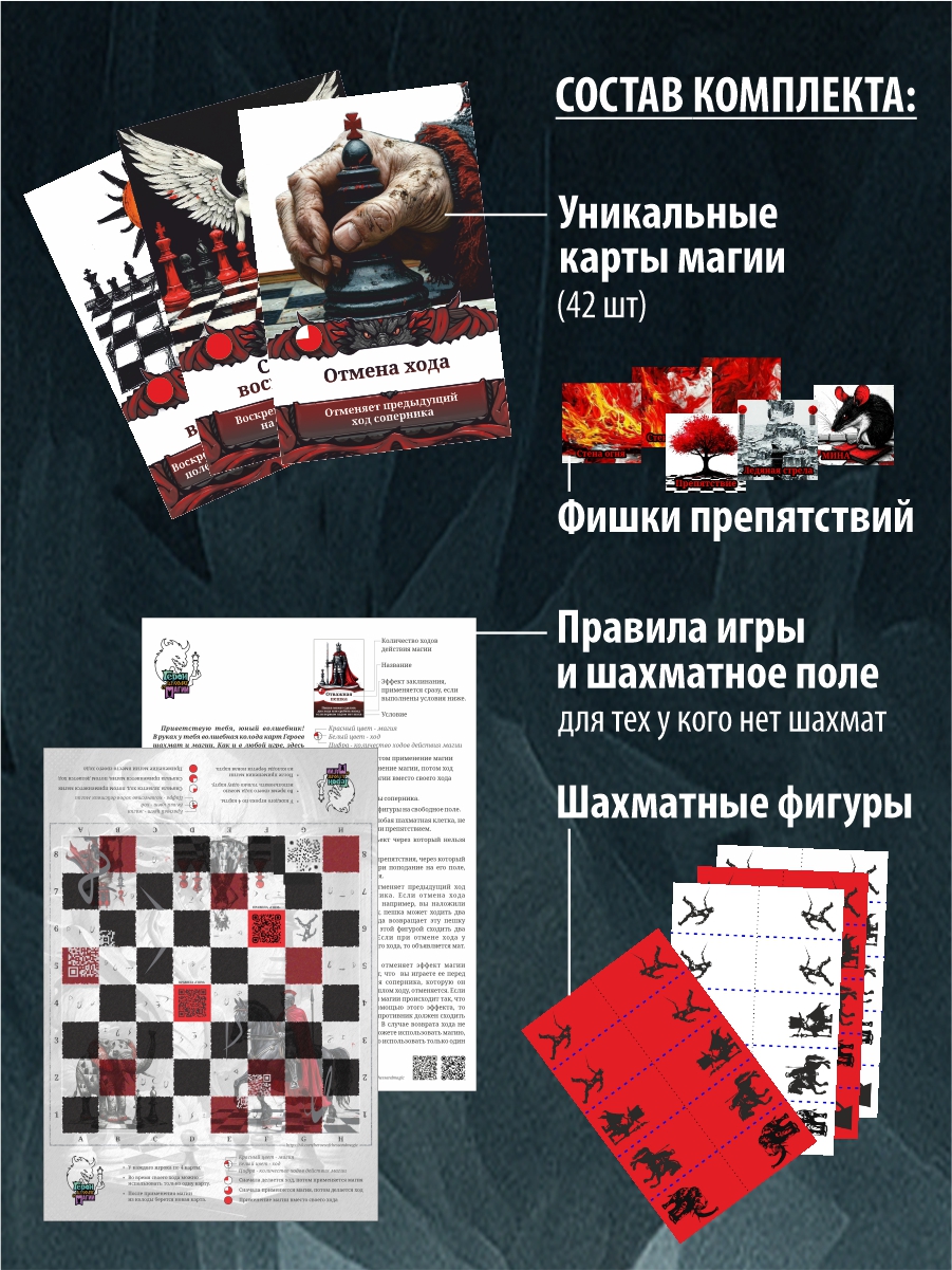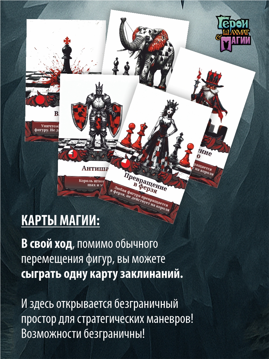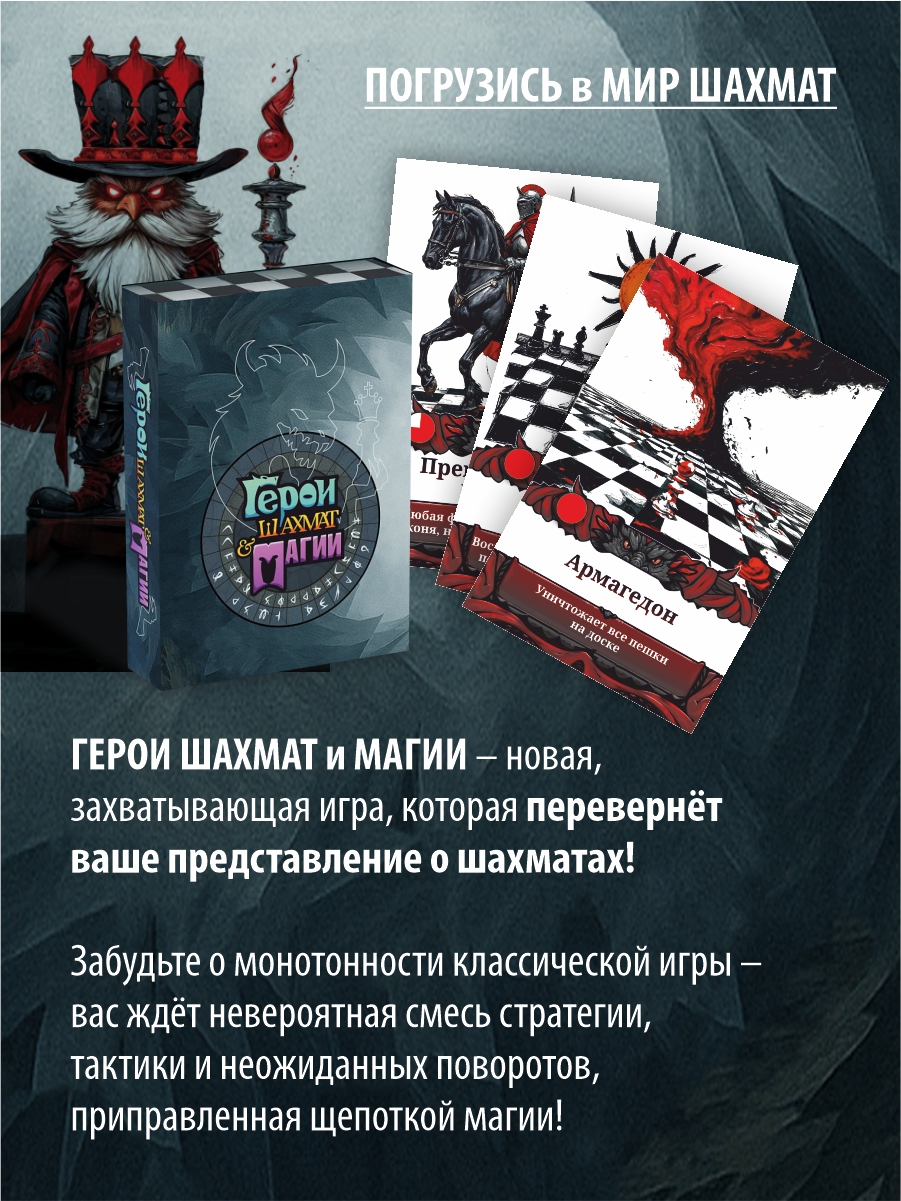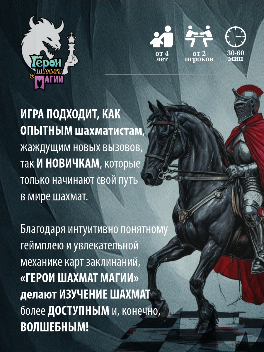 «Герои Шахмат и Магии» — инновационная настольная игра, объединяющая классические шахматы с элементами магии, направленная на расширение аудитории и повышение интереса к интеллектуальной игре среди детей и взрослых. Этот проект представляет собой новый взгляд на шахматы, внедряя уникальный механизм — использование 42 карт магии, которые дополняют правила и делают каждое сражение динамичным и непредсказуемым. В комплект входят стандартное шахматное поле, 40 шахматных фигур и 6 фишек, что создаёт захватывающий и разнообразный игровой процесс в тематике волшебного мира дракона.