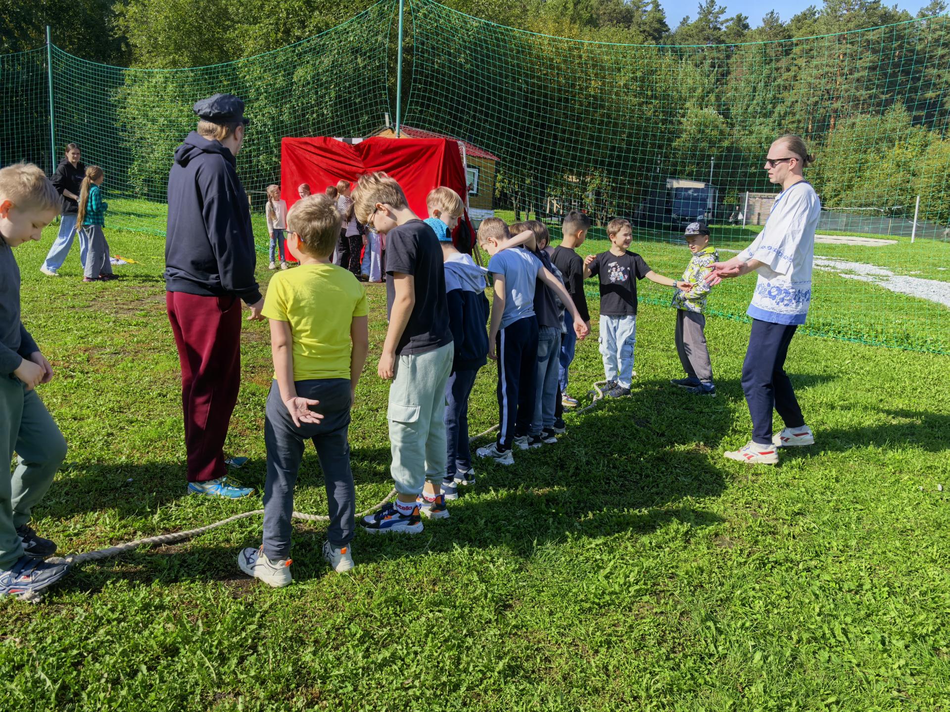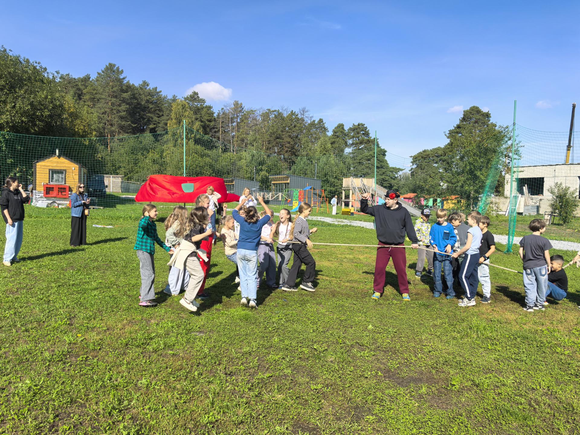 Дальше начинается серия коротких командных заданий. Одно из них — сборка башни из стаканчиков с помощью верёвок: у каждого ребёнка своя часть, и результат получается только если удаётся договориться и двигаться вместе.