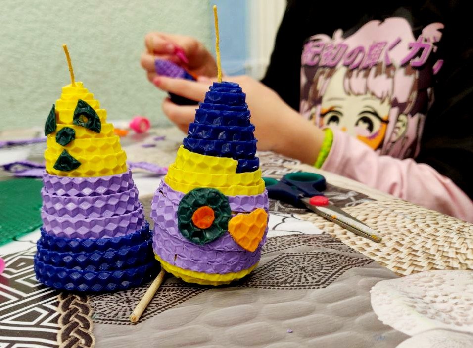 Творческий уголок. Каждый участник сделает мини-ёлочки из натуральной цветной вощины. Это настоящая свеча, которую можно зажечь в Новый год.